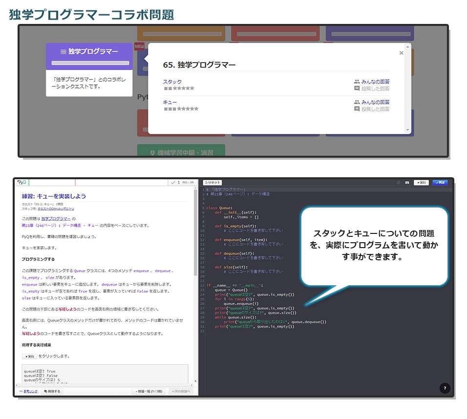 PyQ(パイキュー)では、実際にPythonコードの動作する環境で問題を学習できます。 ですので、書籍のコラボ問題では、本で学んだコードを実際に書きすぐに動かしてみる事ができます。 座学から実践のハードルを下げ、読むだけ、言われるままに書くだけではない 自発的で実践的な学習習慣を育むことが狙いです。