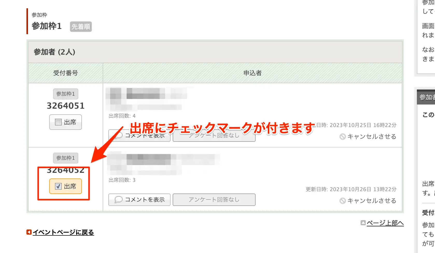 イベント毎に発行された「出席コード」を、イベント管理者が参加申し込みをした参加者に通知・提示を行い、イベント出席の際に「出席コード」を所定のリンクより入力する事で、参加者が出席情報の登録を行えます。