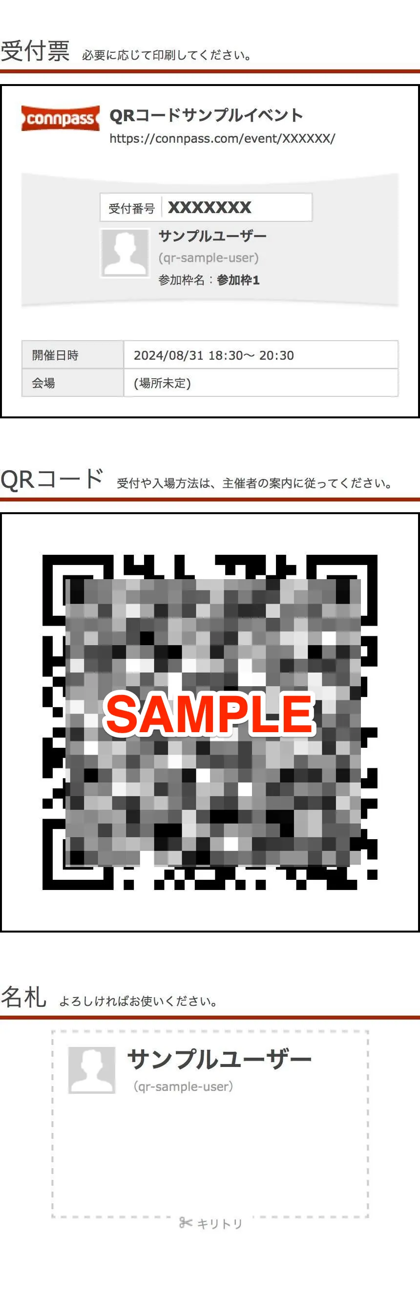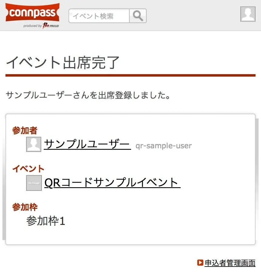 イベント当日の受付などで、参加者が提示したQRコードをイベント主催者が読み取り、URLをブラウザで開くことによって出席登録や申込情報の確認ができる機能です。