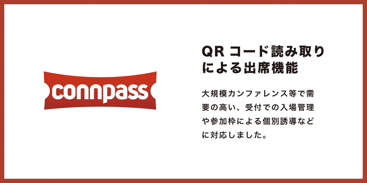 従来、connpassのイベント管理機能には、イベント管理者による出席者管理、イベント出席者による出席コードでの出席管理がありました。2022年以降のオフラインでの大規模カンファレンスの開催数の回復を背景に、「出欠の処理だけでなく、受付窓口での入場管理や誘導を行いたい」という要望に対応。イベント当日のQRコード読み取りによる入場管理機能をリリースする運びとなりました。