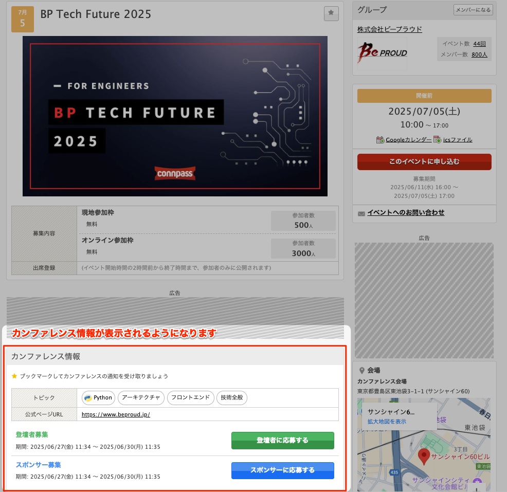 イベント詳細ページにも「カンファレンス情報」欄が追加され、募集のステータスや締切がひと目で確認可能に。関心を持ったユーザーが迷わず応募に進める設計となっています。